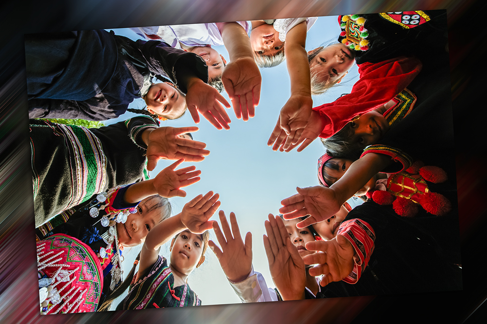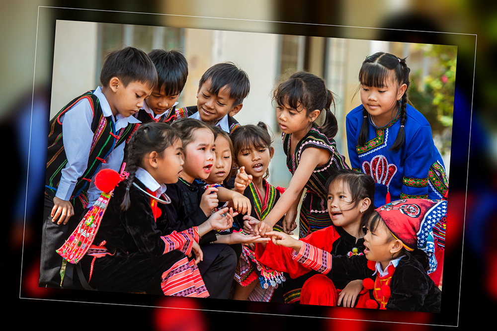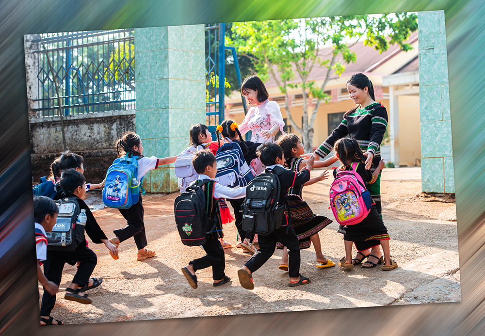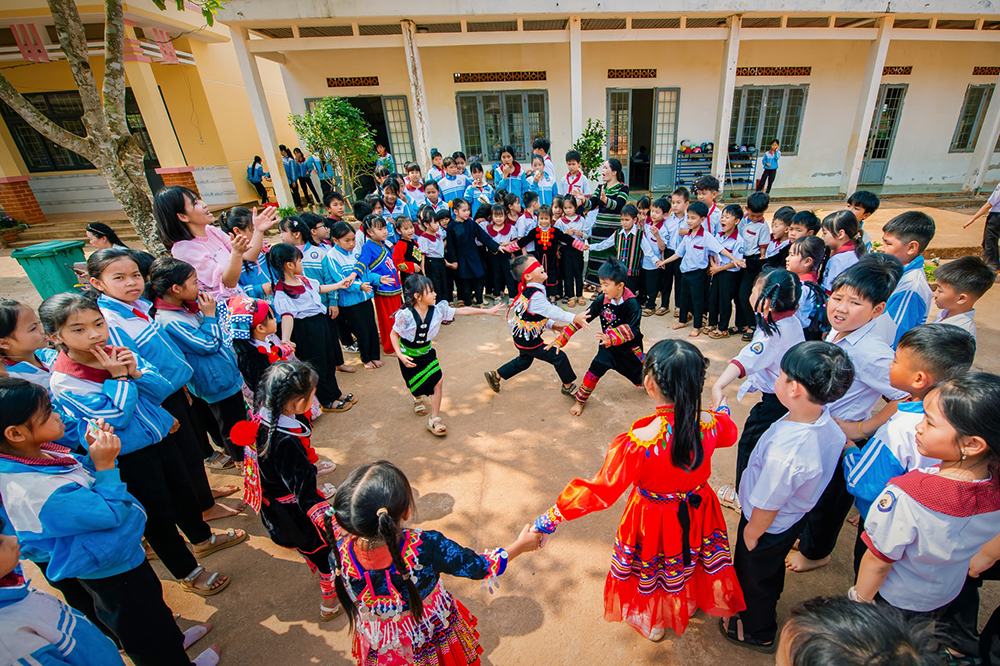 Cô giáo và học sinh vùng đồng bào dân tộc thiểu số cùng nhau đến lớp, mang theo nhiều sắc màu văn hóa đặc trưng trong trang phục truyền thống
