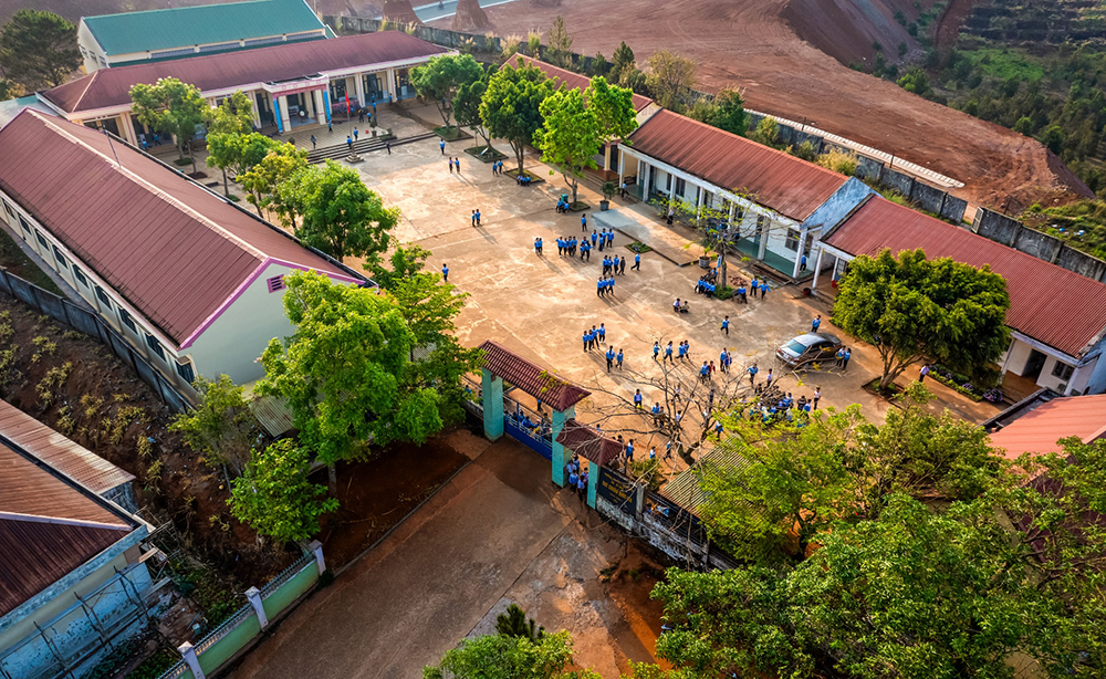 Toàn cảnh Trường TH&THCS Nguyễn Du nhìn từ trên cao – nơi học tập của hàng trăm học sinh vùng khó, đang từng bước được đầu tư, hoàn thiện