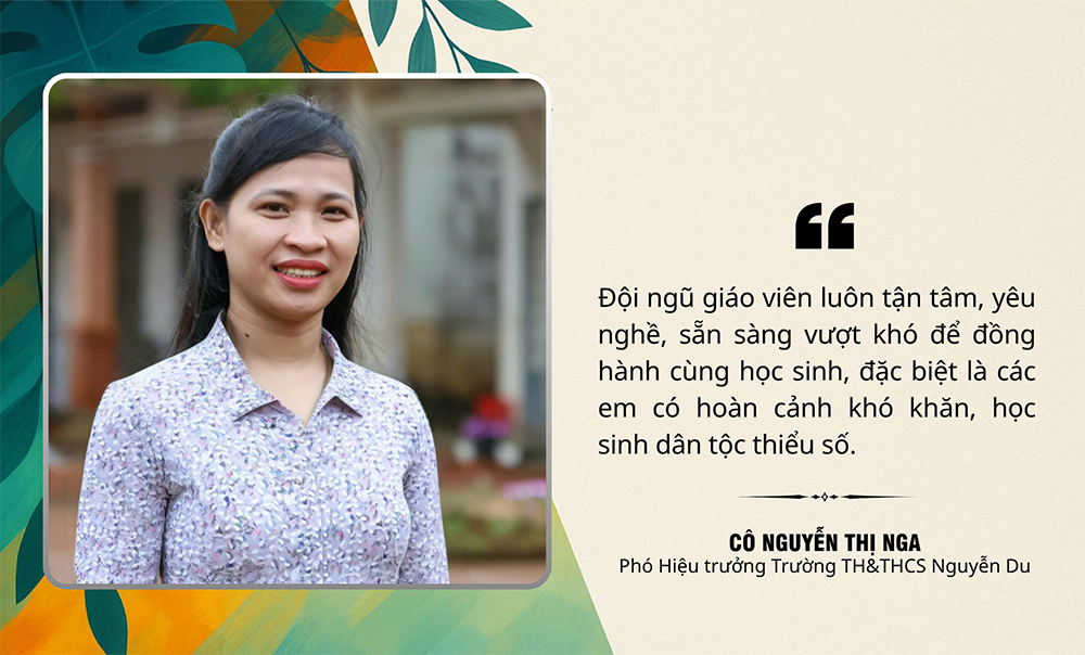 Cô Nguyễn Thị Nga, Phó Hiệu trưởng Trường TH&THCS Nguyễn Du cho biết: Dù điều kiện còn nhiều hạn chế, song nhà trường luôn nỗ lực nâng cao chất lượng dạy và học. Cơ sở vật chất từng bước được quan tâm đầu tư; các phòng học được bố trí khoa học, bảo đảm ánh sáng, thoáng mát.