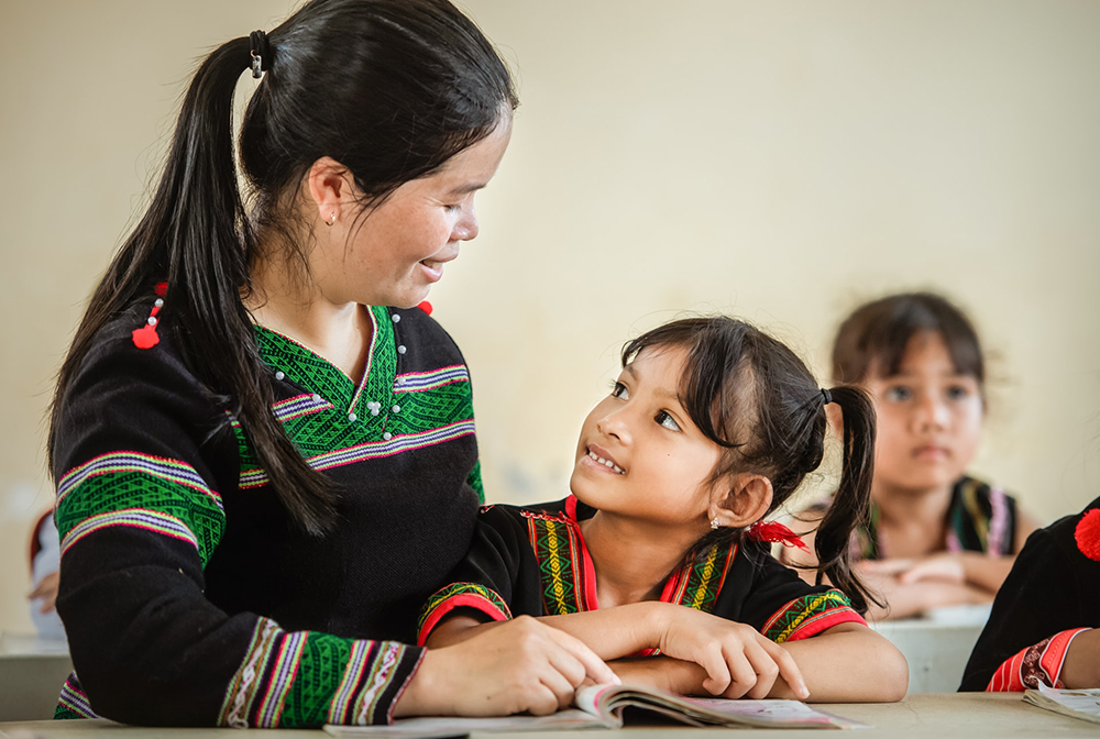 Cô giáo ân cần chỉ bài cho học sinh