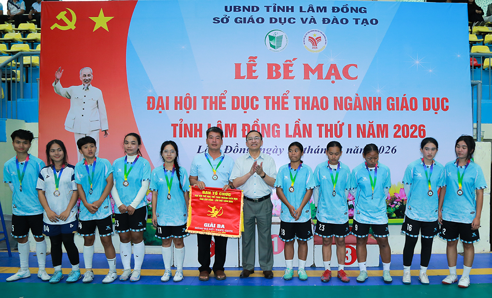 Ban Tổ chức trao HC đồng nội dung bóng đá nữ khối THPT tại Đại hội TDTT ngành Giáo dục tỉnh Lâm Đồng lần thứ I năm 2026