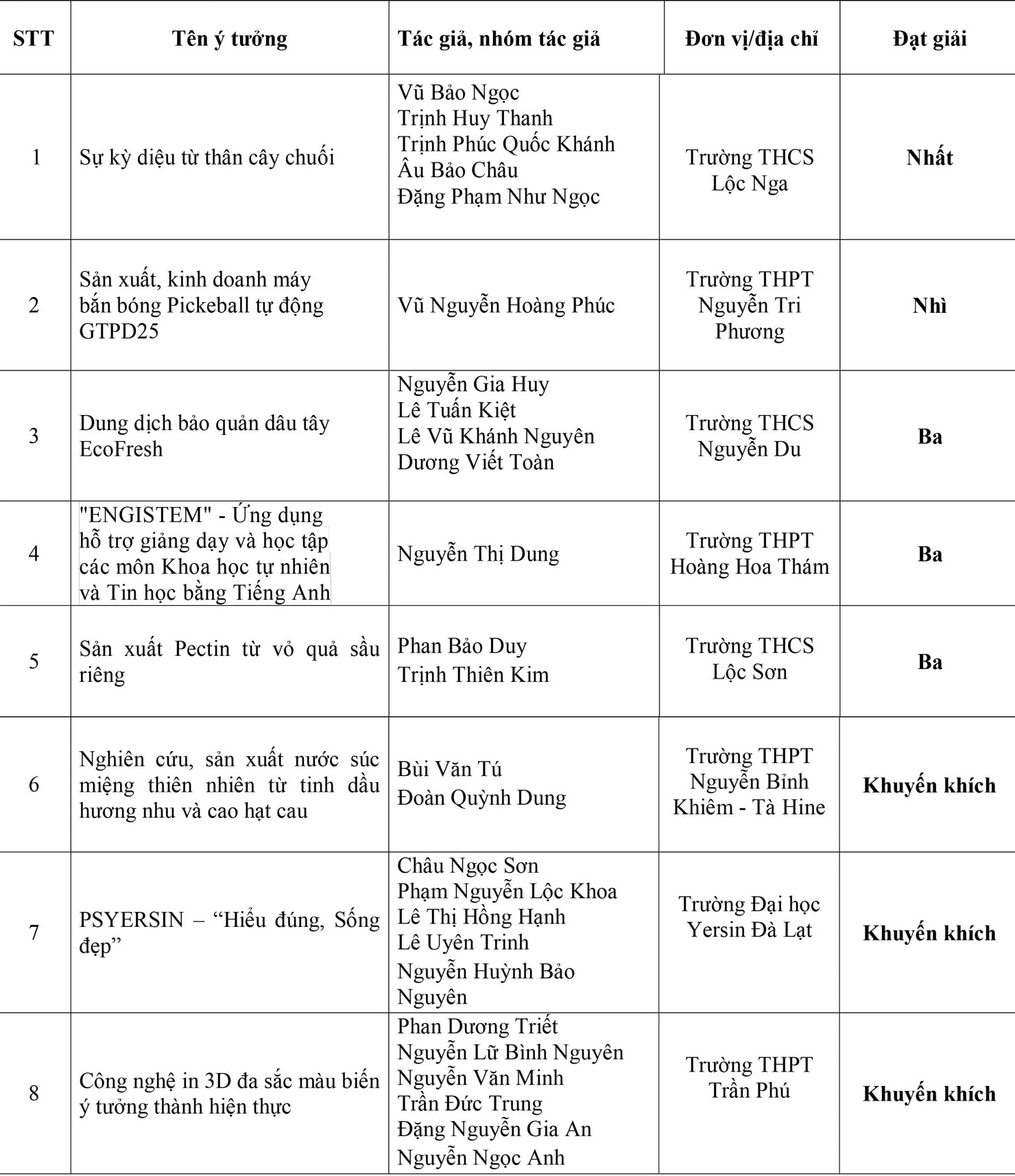 Kết quả, Ban Tổ chức đã trao giải nhất bảng ý tưởng cho nhóm tác giả Vũ Bảo Ngọc, Trịnh Huy Thanh, Trịnh Phúc Quốc Khánh, Âu Bảo Châu, Đặng Phạm Như Ngọc, Trường THCS Lộc Nga với ý tưởng Sự kỳ diệu từ thân cây chuối.
