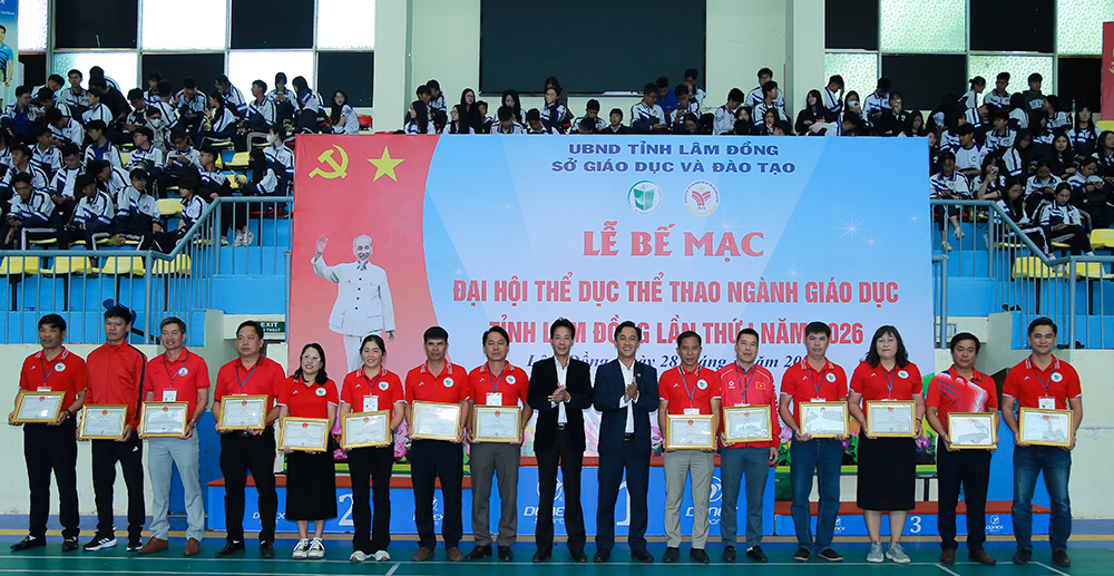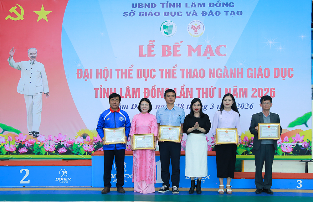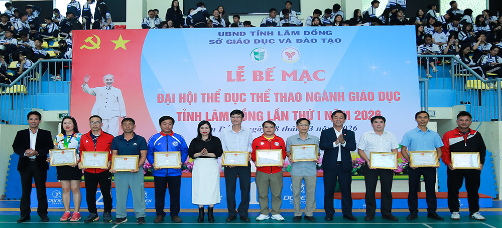 Ban Tổ chức trao Giấy khen của Giám đốc Sở Giáo dục và Đào tạo cho các tập thể có thành tích tốt tại Đại hội Thể dục thể thao ngành Giáo dục tỉnh Lâm Đồng lần thứ I năm 2026.