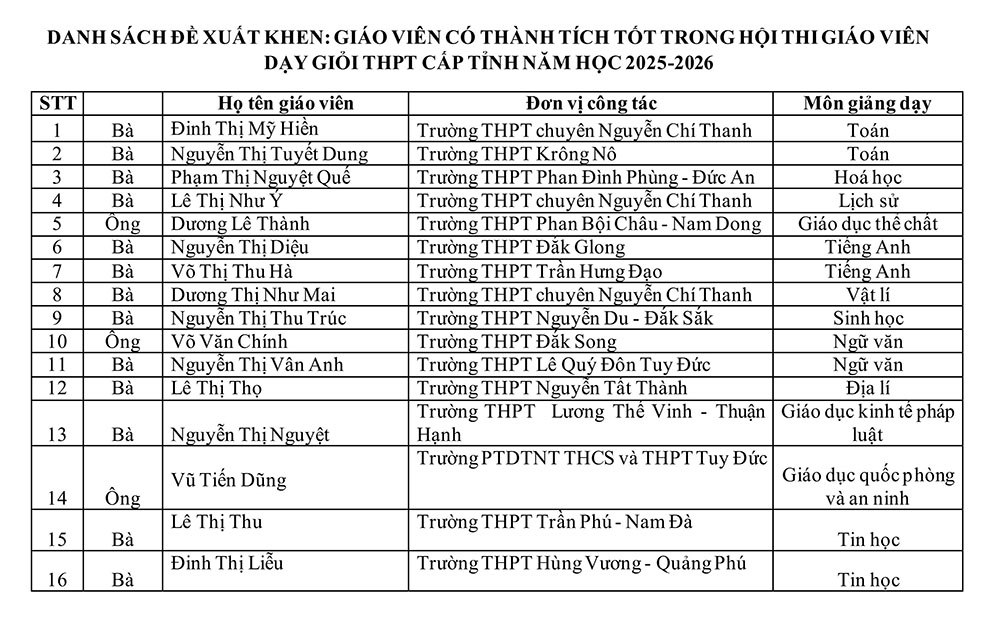 Danh sách 16 giáo viên được Giám đốc Sở GDĐT tặng Giấy khen.