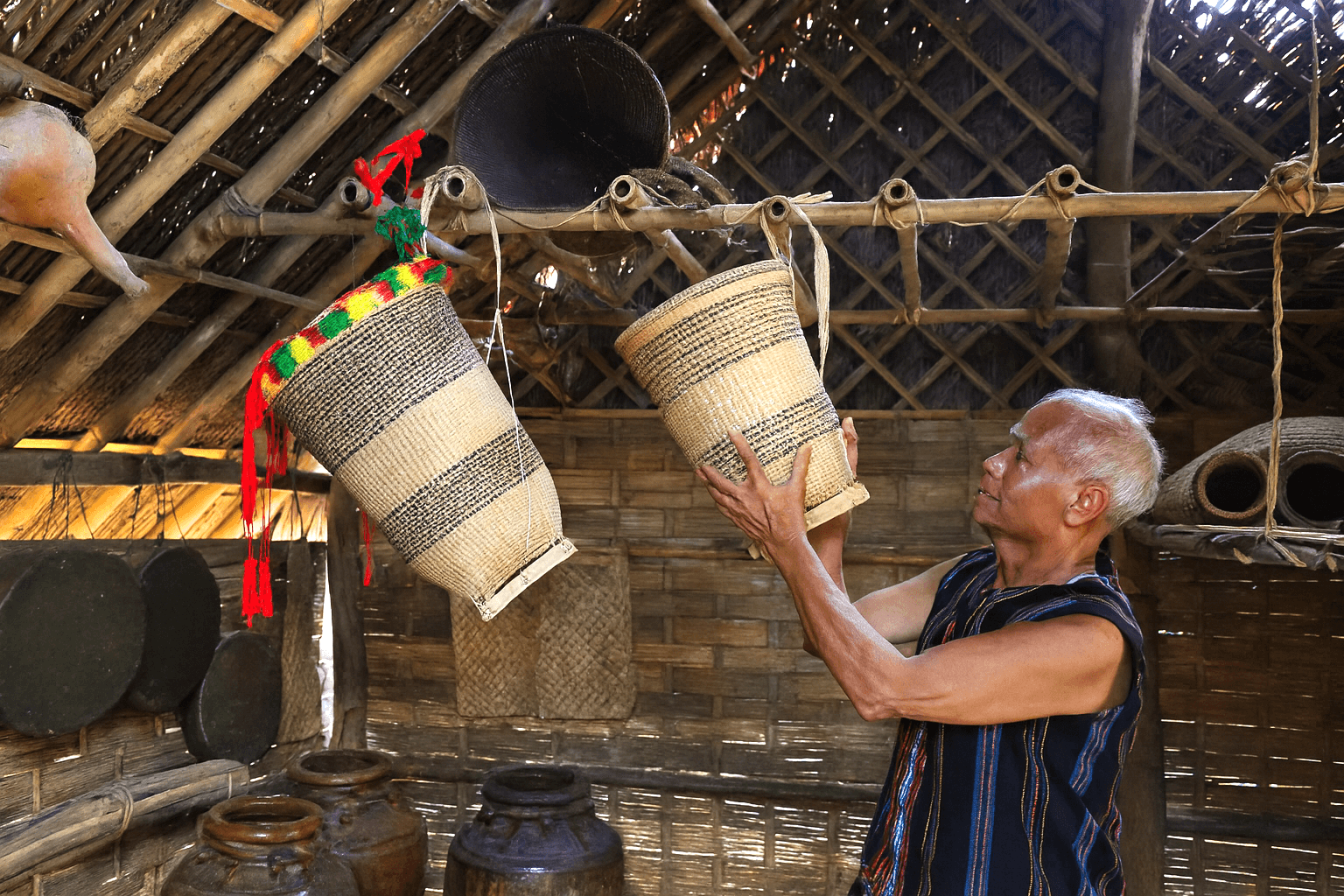 Ông còn tự tay sưu tầm, dựng nên một căn nhà sàn truyền thống với mái tranh, vách tre nứa - như một “kho tàng văn hóa thu nhỏ” của người Châu Mạ. Bên trong căn nhà ấy, từng bộ chiêng, chum, ché, gùi, nỏ… được ông lau chùi, sắp xếp cẩn thận. Với ông, đó không chỉ là những vật dụng cũ, mà là ký ức, là truyền thống, là linh hồn văn hóa của dân tộc.