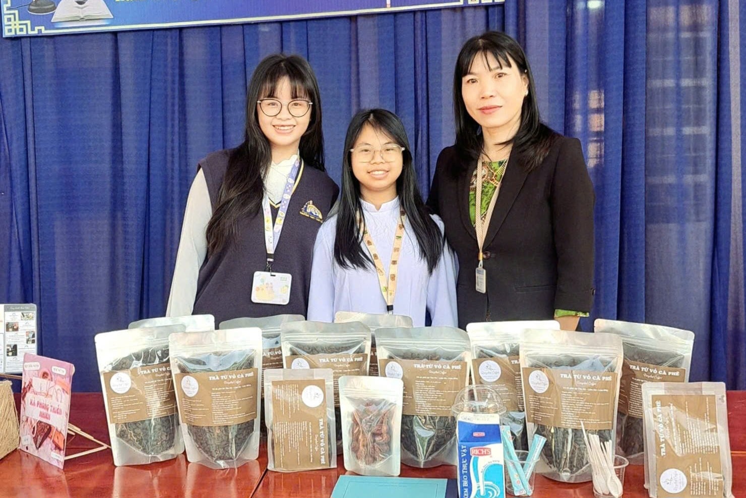 Cô Ngô Thị Tuyết Mai cùng hai học sinh Trần Uyên và Mỹ Hoa bên sản phẩm “Trà từ vỏ cà phê” tại Ngày hội STEM Trường THPT Tân Hà, nơi ươm mầm khát vọng sáng tạo của tuổi trẻ.