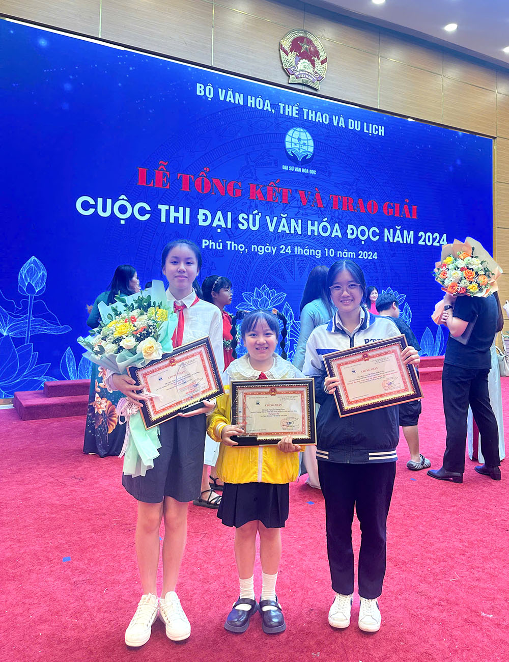 Từ trái qua: em Nguyễn Trần Khanh Hân, Nguyễn Hương Thảo và Nguyễn Thanh Thảo Uyên nhận giải thưởng tại Lễ Tổng kết và trao giải quốc gia