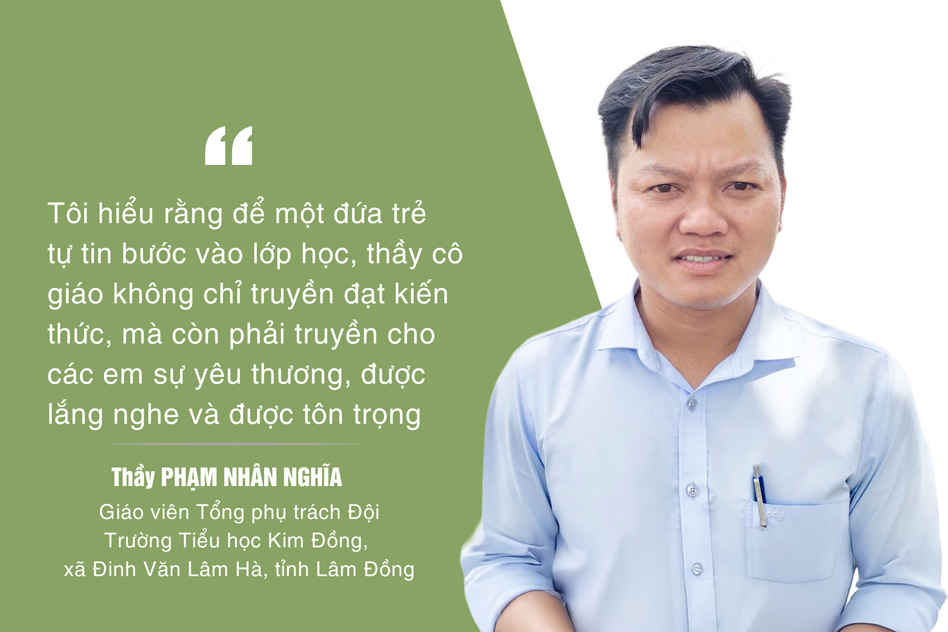 Trong đó, thầy Nghĩa là giáo viên, Tổng phụ trách Đội rất tâm huyết, năng nổ sáng tạo trong công tác, đặc biệt có nhiều hoạt động chăm lo học sinh khó khăn, lan tỏa tình yêu thương, thắp lên trong các em động lực học tập, niềm tin về một tương lai tốt đẹp hơn.