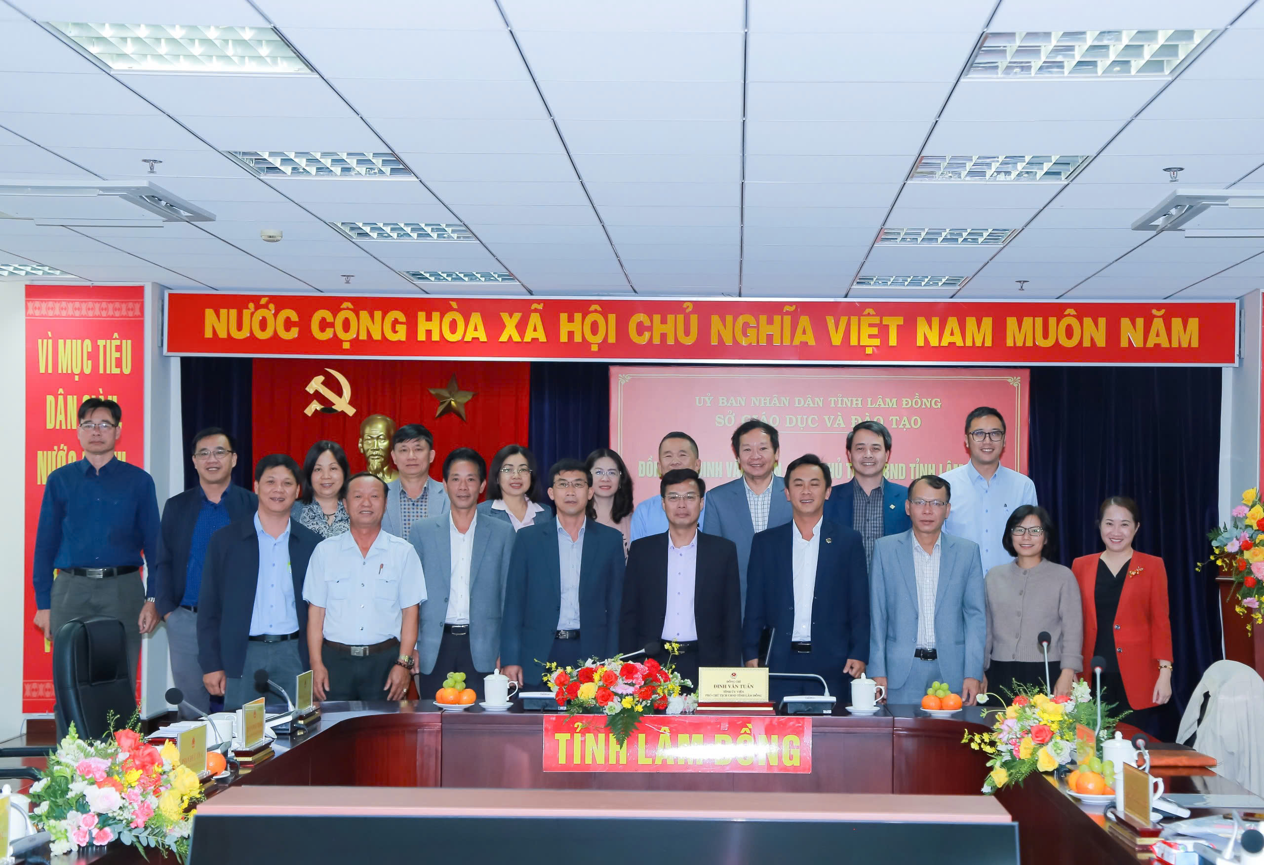 Phó Chủ tịch UBND tỉnh Lâm Đồng Đinh Văn Tuấn và đoàn công tác chụp ảnh lưu niệm với tập thể lãnh đạo Sở Giáo dục và Đào tạo